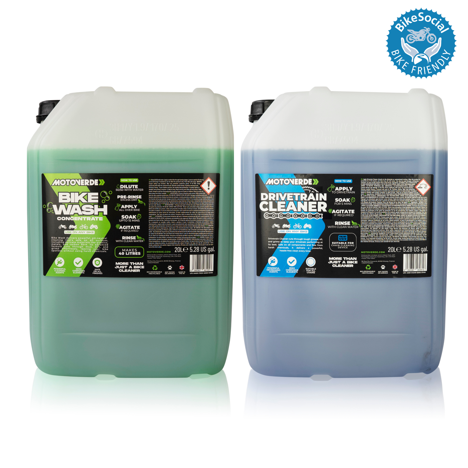Bike Wash 1L Gotowy do użycia: Środek czyszczący do rowerów, który jest bezpieczny dla wszystkich rowerów i ich części! Wszyscy wiemy, jak wrażliwe mogą być rowery i ich części, dlatego uważamy, że tak ważne jest, aby wybrać odpowiedni środek czyszczący. Nasz gotowy do użycia środek czyszczący do rowerów zawiera specjalnie dobraną mieszankę w pełni biodegradowalnych środków powierzchniowo czynnych, które szybko czyszczą każdą część Twojego roweru. Bike Wash zapewnia silne czyszczenie poprzez usuwanie uporczywego brudu, błota, osadu, piasku i plam gliny przy minimalnym wysiłku. Pozostawia wykończenie bez smug, jednocześnie będąc bezpiecznym dla wszystkich wrażliwych powierzchni Twojego roweru. Pierwotnie opracowany do motocykli motocrossowych, wiemy, jak czyścić brud! Bike Wash można stosować na wszystkich rowerach i częściach roweru, niezależnie od tego, czy są mocno zabrudzone, czy wymagają tylko lekkiego czyszczenia. Wierzymy, że środek czyszczący do rowerów powinien zapewnić Ci spokój ducha, dlatego upewniliśmy się, że nasza formuła nie zawiera kwasów, soli alkalicznych ani żadnych innych agresywnych chemikaliów, które mogą uszkodzić Twój rower, dzięki czemu możesz mieć najlepsze możliwe doświadczenie czyszczenia. Środek czyszczący do układów napędowych 1L: Najłatwiejszy sposób na wyczyszczenie łańcucha i silnika! Dzięki silnemu działaniu czyszczącemu Motoverde Drivetrain Cleaner usuwa olej, smar, wnikliwy brud i zanieczyszczenia z każdego łańcucha, powierzchni lub silnika. Łatwy w użyciu produkt, który nadaje się do stosowania w urządzeniu do czyszczenia łańcucha lub do bezpośredniego spryskiwania powierzchni. Motoverde Drivetrain Cleaner to niezbędny produkt do posiadania w swojej kolekcji środków do czyszczenia rowerów! Ten produkt nie zawiera żadnych agresywnych składników, więc jest bezpieczny dla łańcucha, ogniw i wszelkich otaczających materiałów, takich jak uszczelki gumowe lub tworzywa sztuczne.